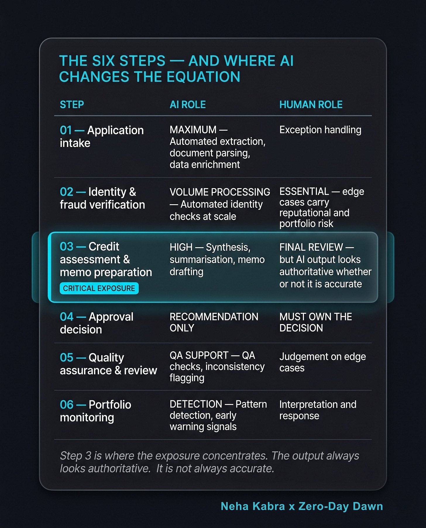 The human approver at Step 4 relies on that memo to make a final decision. If something is wrong and it looks right, the override function exists on paper but not in practice. The glossiness of AI output is not a feature in a credit context. It is a risk that has to be designed around before deployment — not discovered at enforcement.