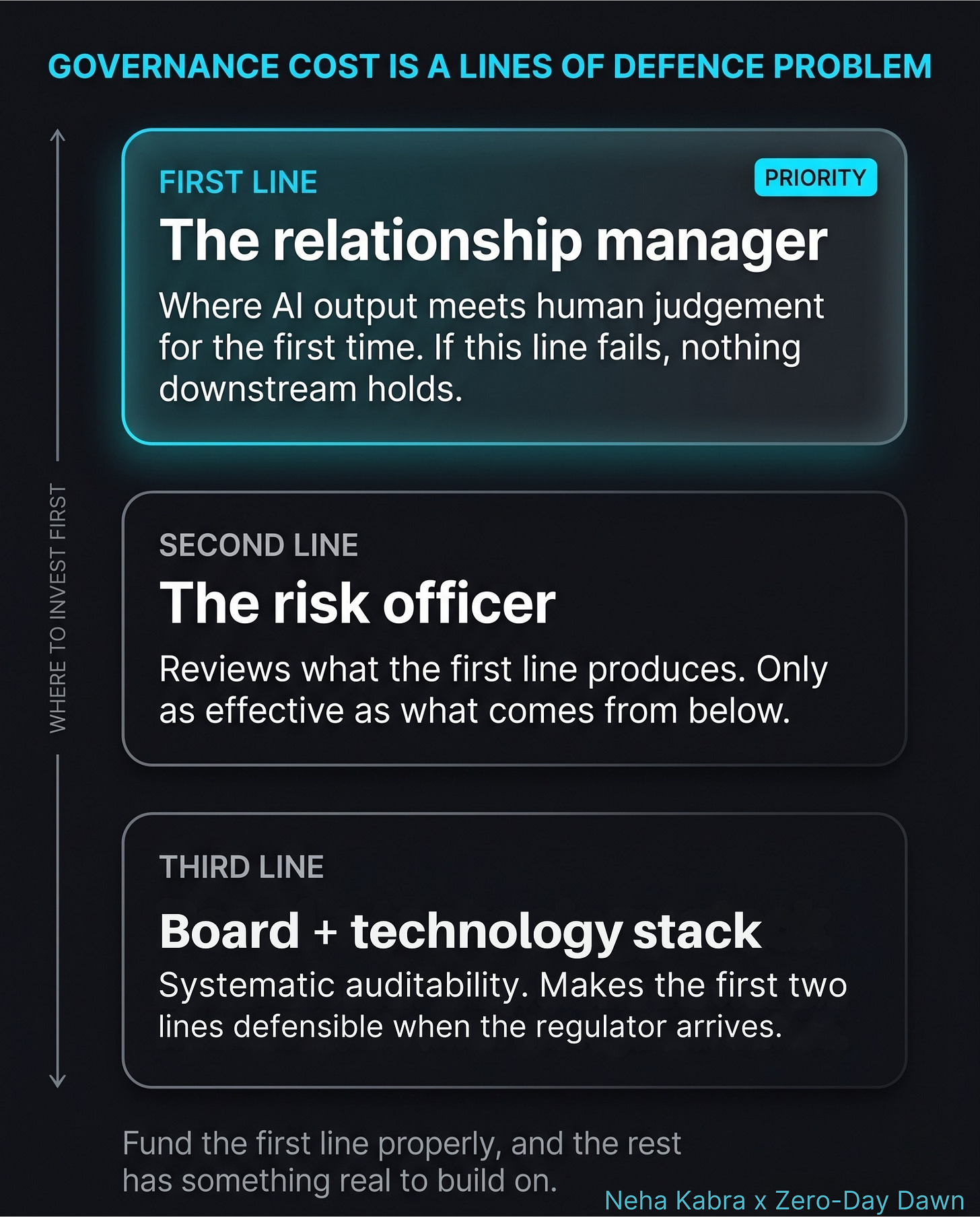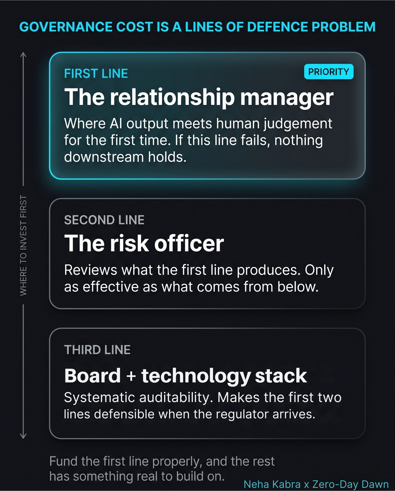 With finite governance budget and multiple competing demands, sequencing matters. In credit decisioning, the first line — the relationship manager, the workbench, the point where AI output meets human judgement — gets funded first. If the first line fails, everything downstream fails with it. Start there. Build the audit trail around it. Extend outward as capacity allows.